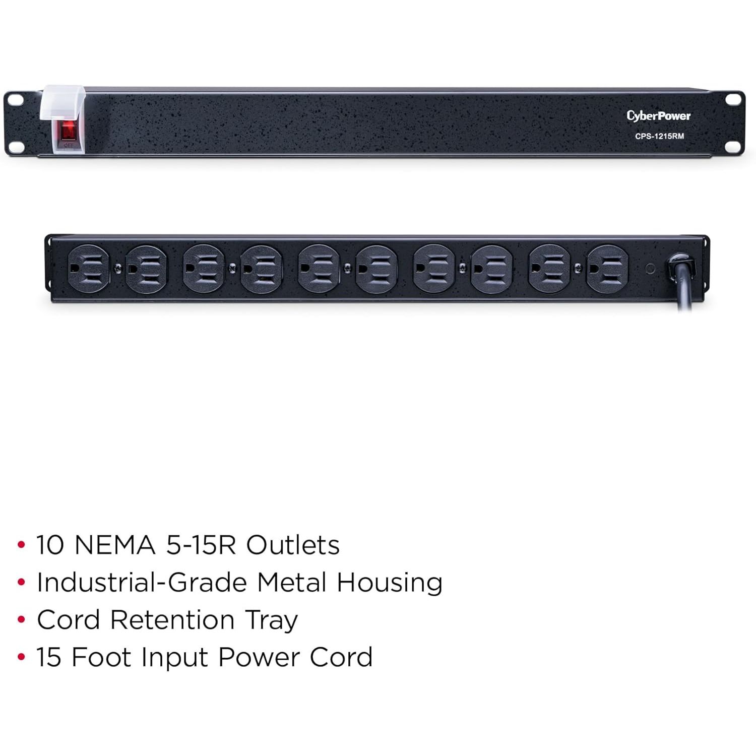 The CyberPower CPS1215RM, a 10-outlet (rear) rackmount power distribution unit (PDU), provides 100-125V 15A output. It distributes power to 10 NEMA 5-15R receptacles from a single NEMA 5-15P input with unfiltered electrical pass-through.It can be mounted horizontally, includes a cord retention tray. Designed for datacenters and other electrically demanding applications, the CPS1215RM has durable metal housing and a 15-foot AC power cord.