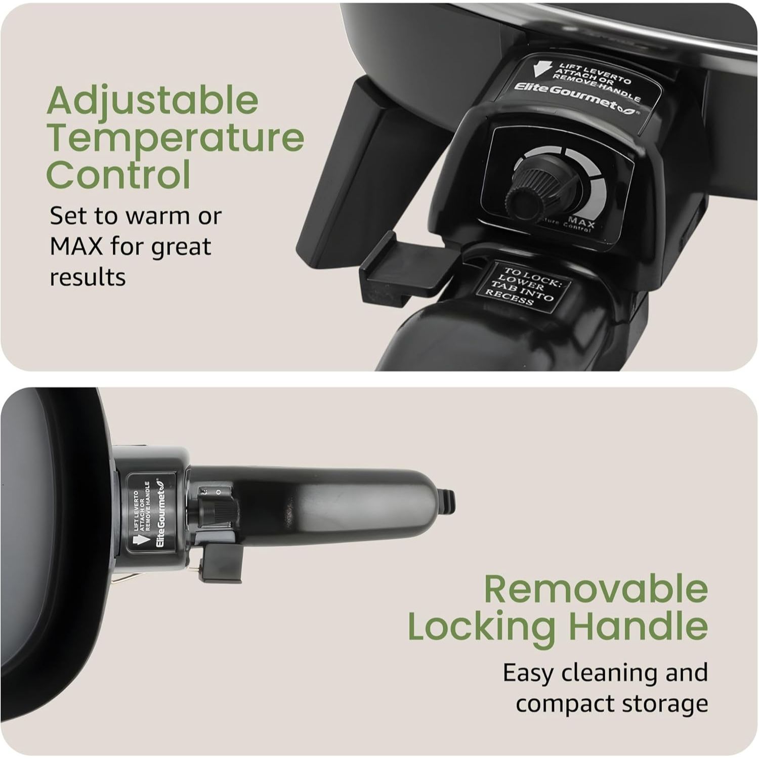 • REMOVABLE LOCKING HANDLE: The clip-on handle easily unlocks from the heating pan for easy cleaning and storage.
